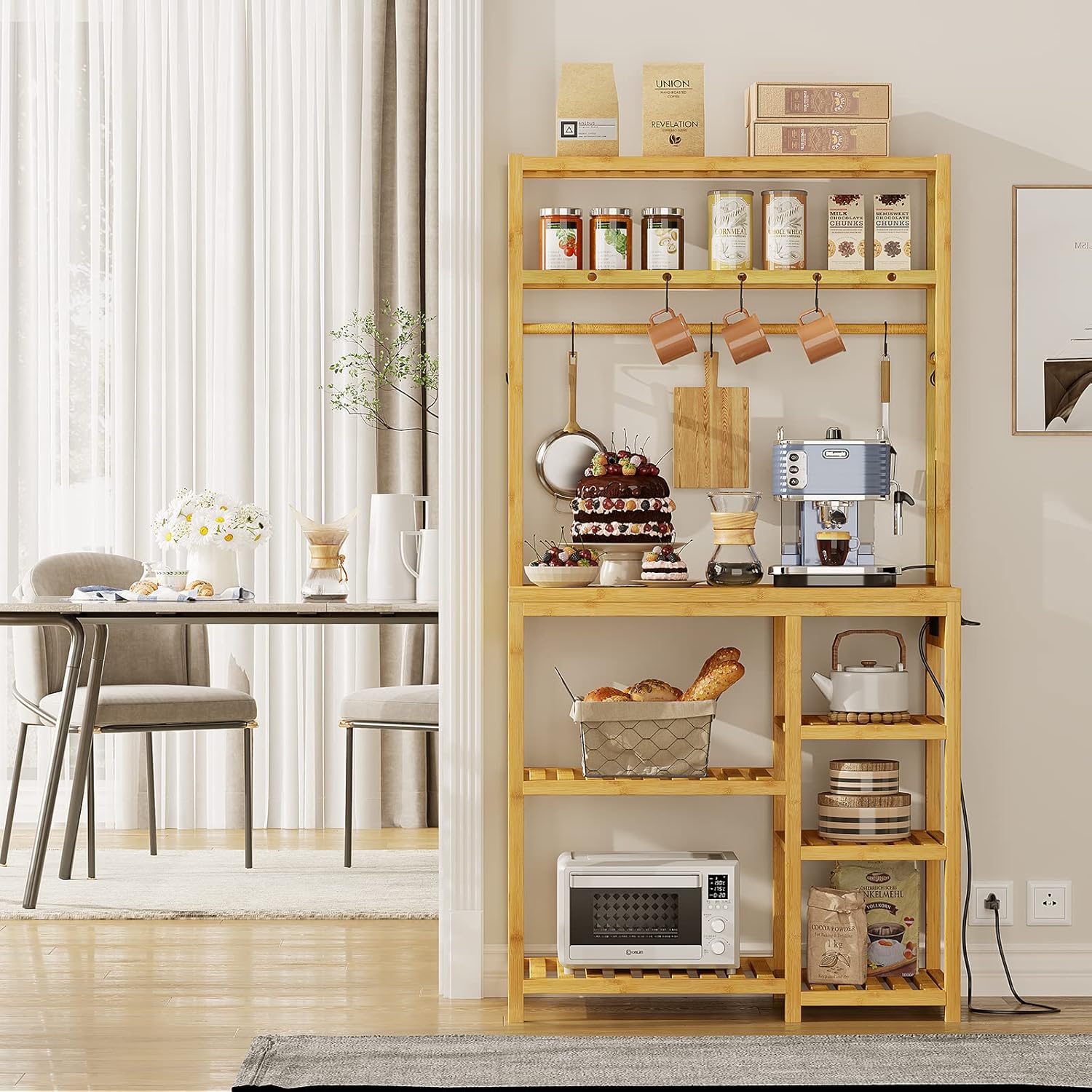 Bakers Rack with Power Outlets, 8-Tier Microwave Stand, Kitchen Utility Storage Shelf 10 S-Shaped Hooks, Coffee Bar Table Station, Standing Rack, 31.5 x 15.7 x 65 Inches, Bamboo