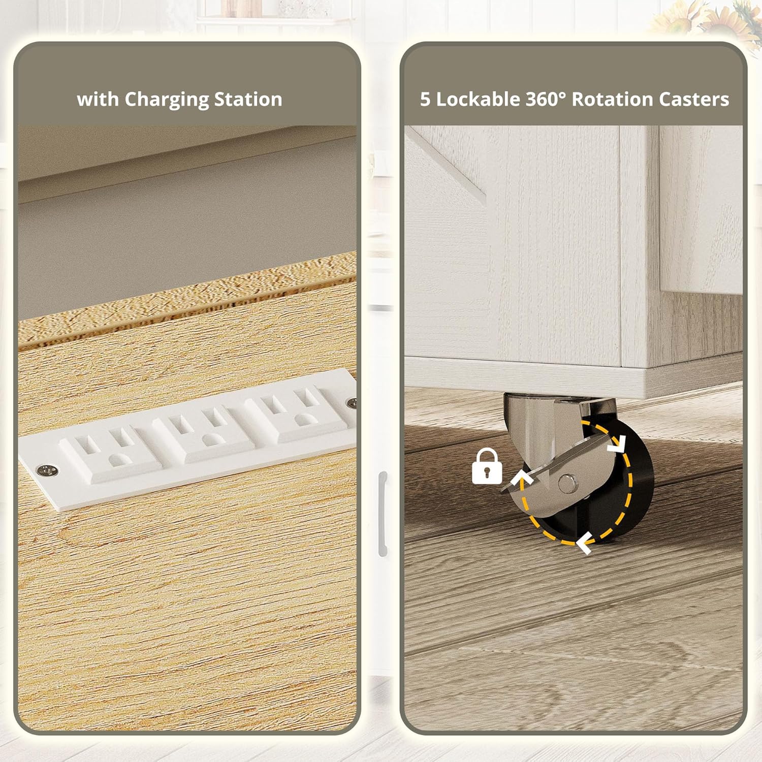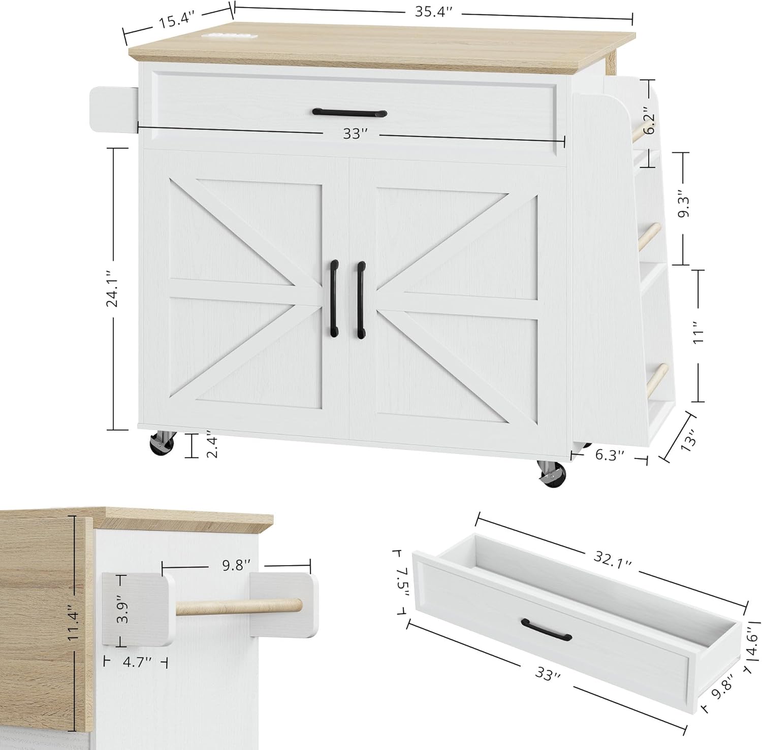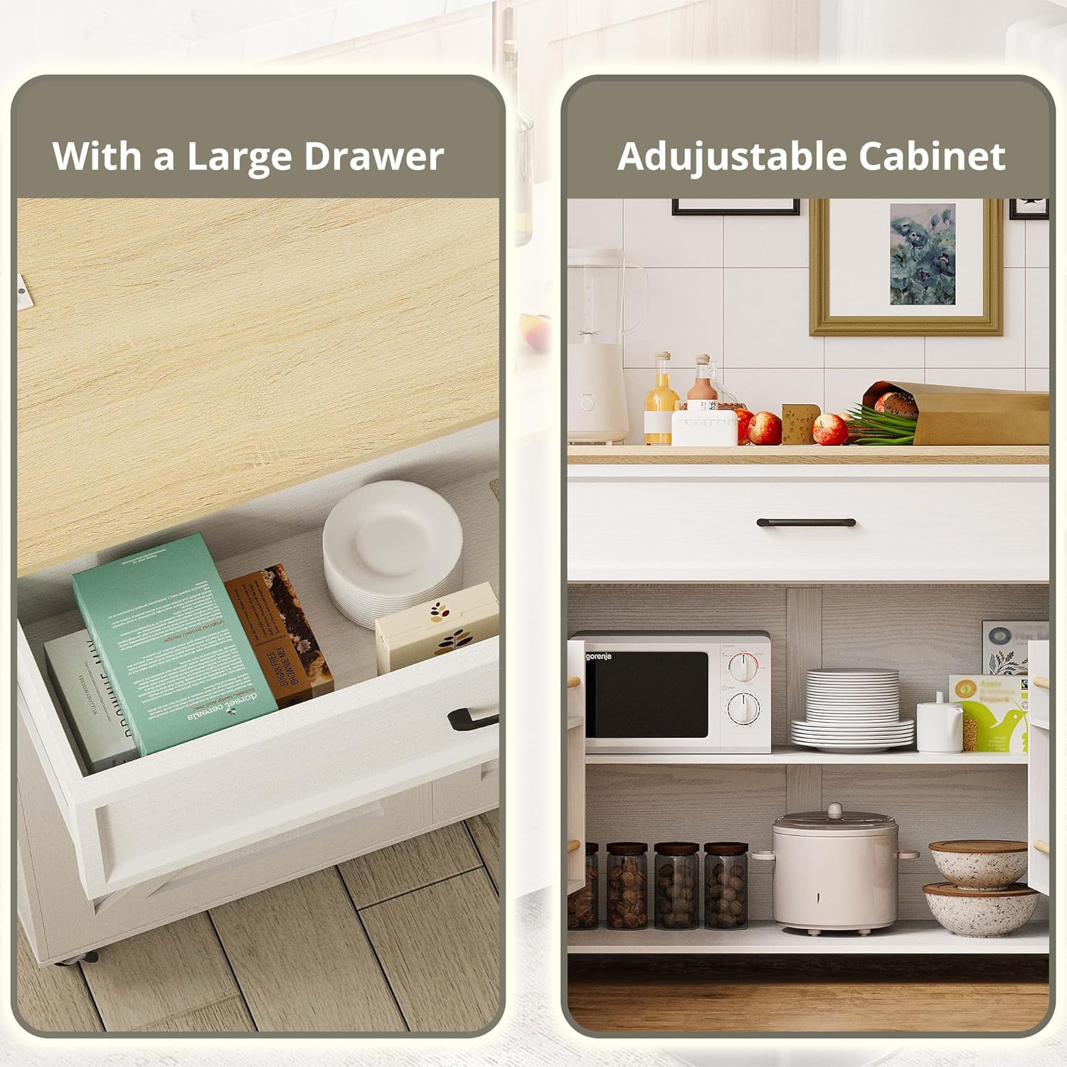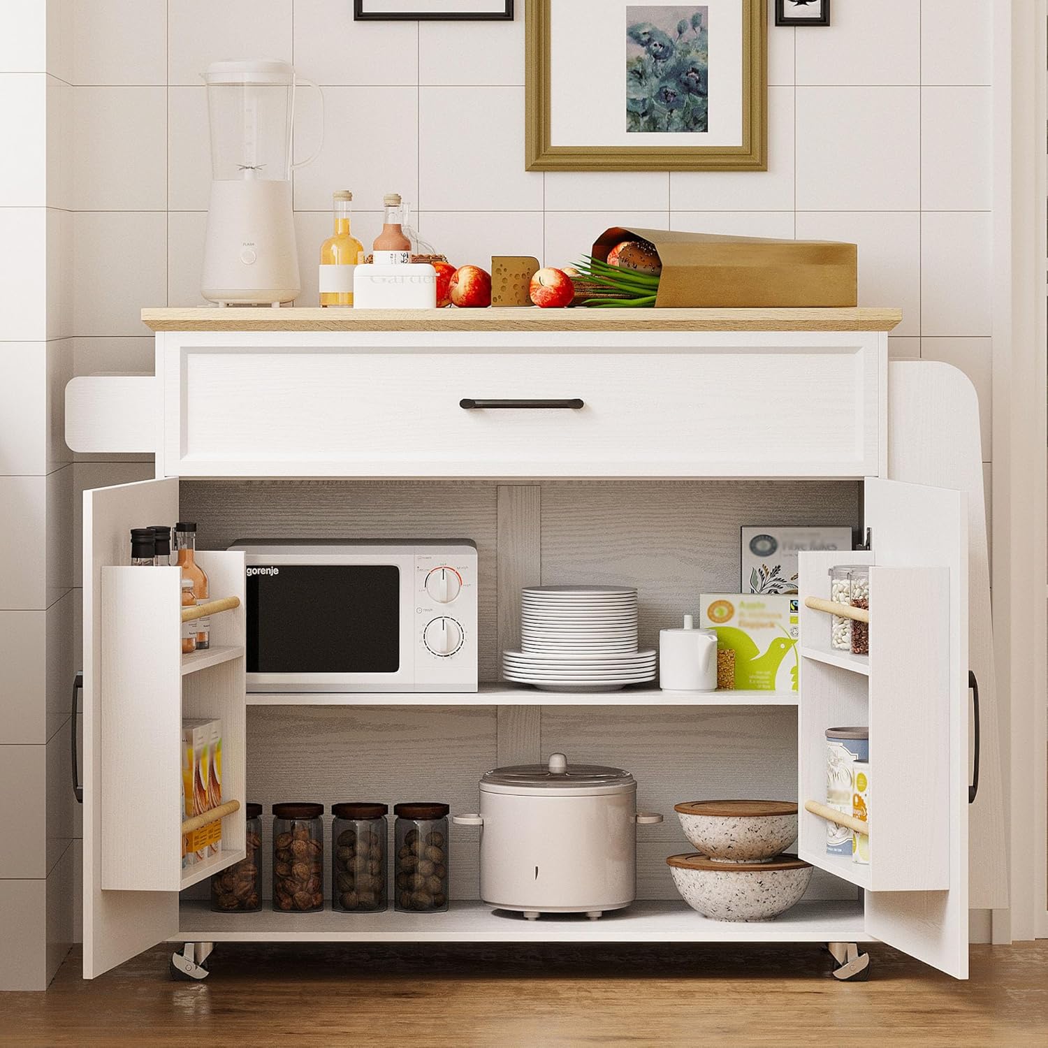 Equipped with convenient wheels, this kitchen cart can be easily moved around, making it perfect for small kitchens or for hosting gatherings where you need additional serving space. The storage cabinet and drawer offer ample room for storing kitchen essentials, keeping your space organized and clutter-free.