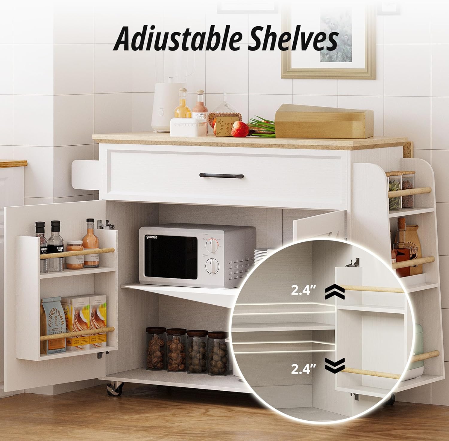 IRONCK Rolling Kitchen Island Table with Drop Leaf, Mobile Kitchen Cart with on Wheels, Storage Cabinet, Drawer, Spice Towel Rack, White