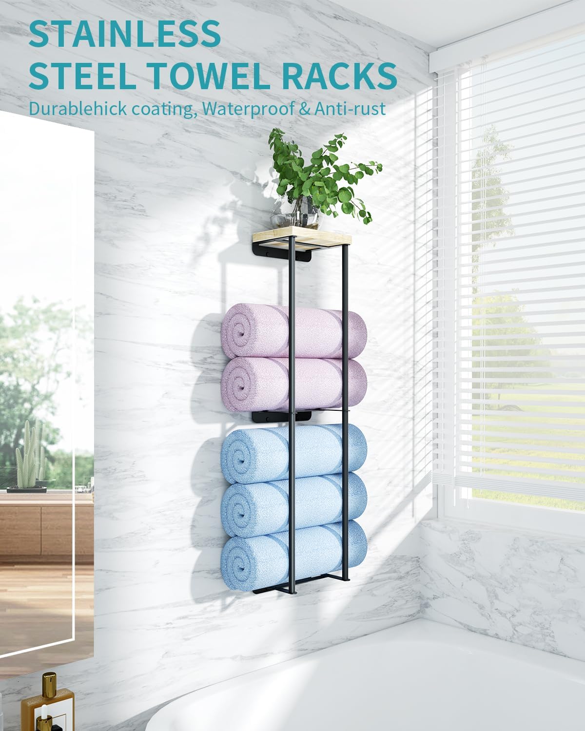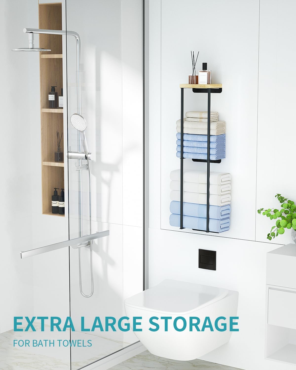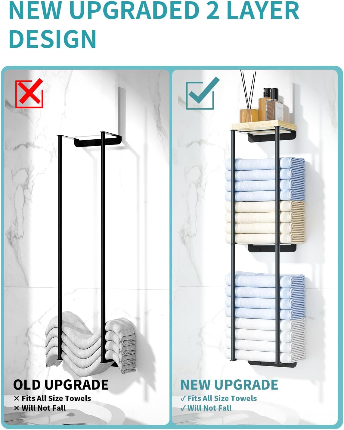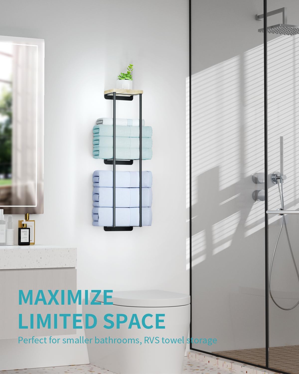 Towel Racks for Bathroom, 2 Tier Wall Towel Holder with Wood Shelf, Metal Wall Mounted Towel Rack Bathroom Organizers and Storage, Black